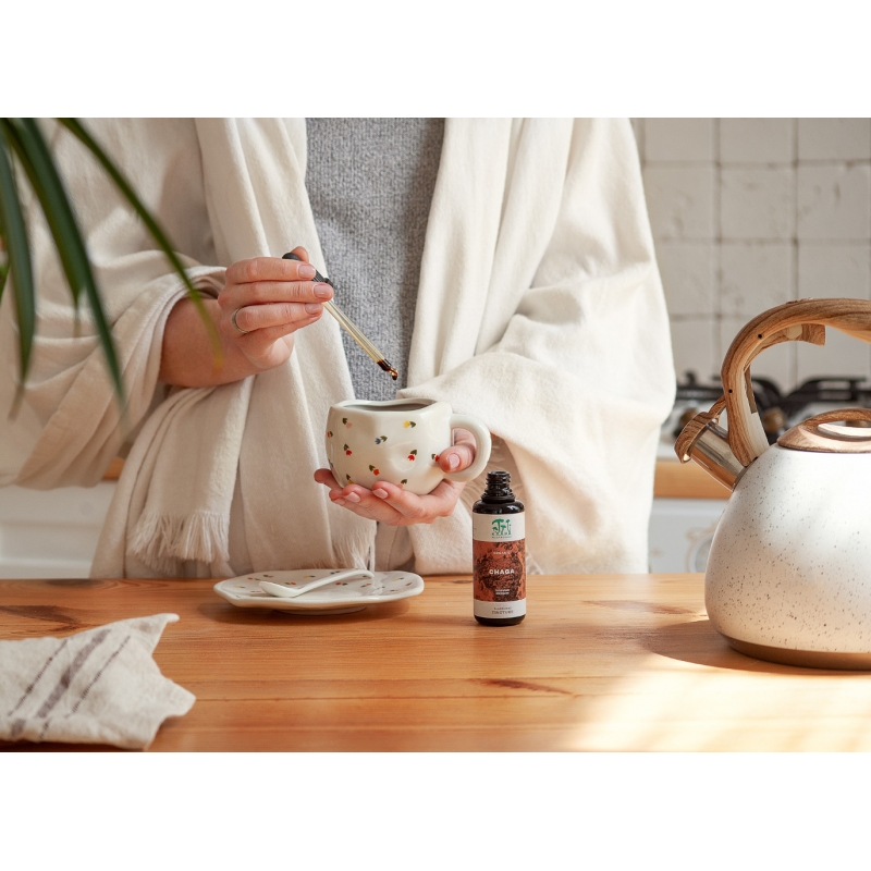 Chaga is a natural source of a wide range of bioactive substances – it contains diverse polysaccharides including beta-glucans, triterpenes, melanin, phenols and phenolic compounds. It also obtains valuable substances from the host birch, such as betulin and betulinic acid. It also contains vitamins B and D, beta-carotene, magnesium, calcium, iron, copper, zinc, manganese and germanium.