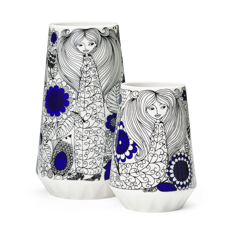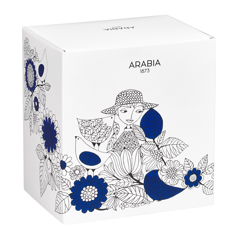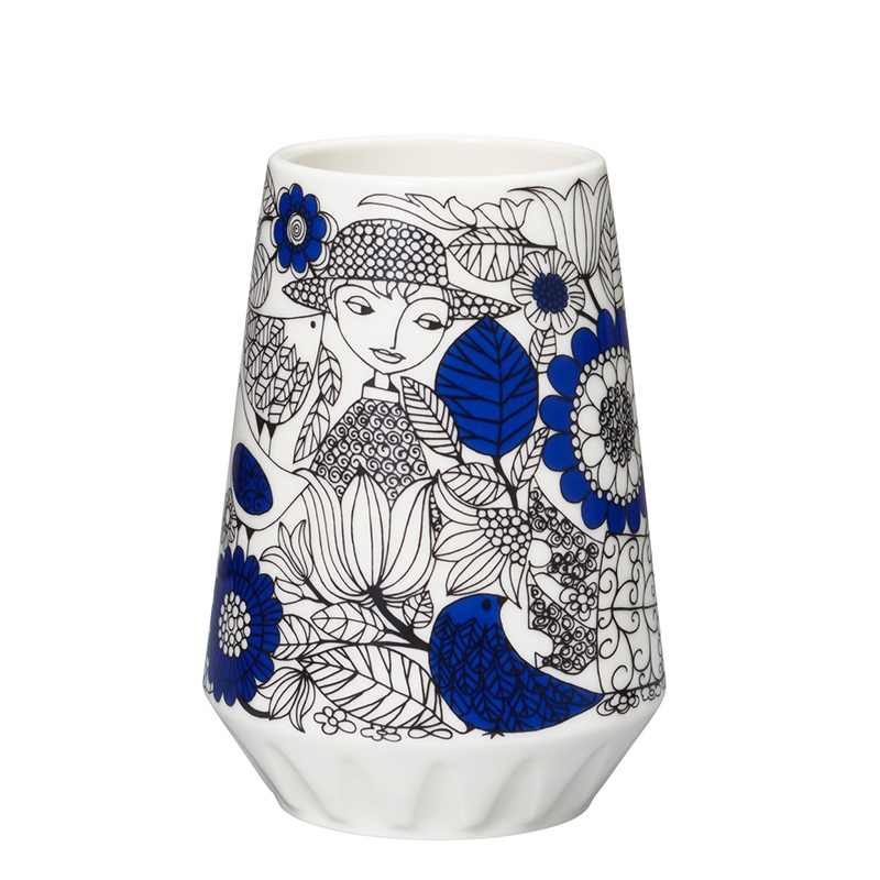 Porcelain vase from the classic Pastoraali collection, designed by long-time designer of the Finnish porcelain company Arabia Esteri Tomula. Black and white illustrations with contrasting blue elements are full of details. Simply timeless porcelain that will make you happy every day.