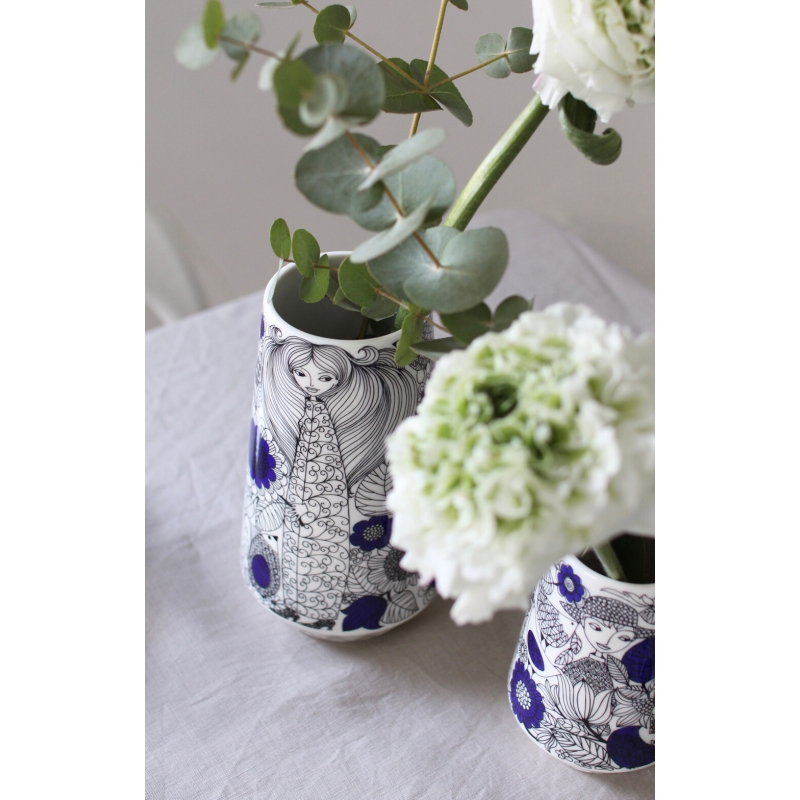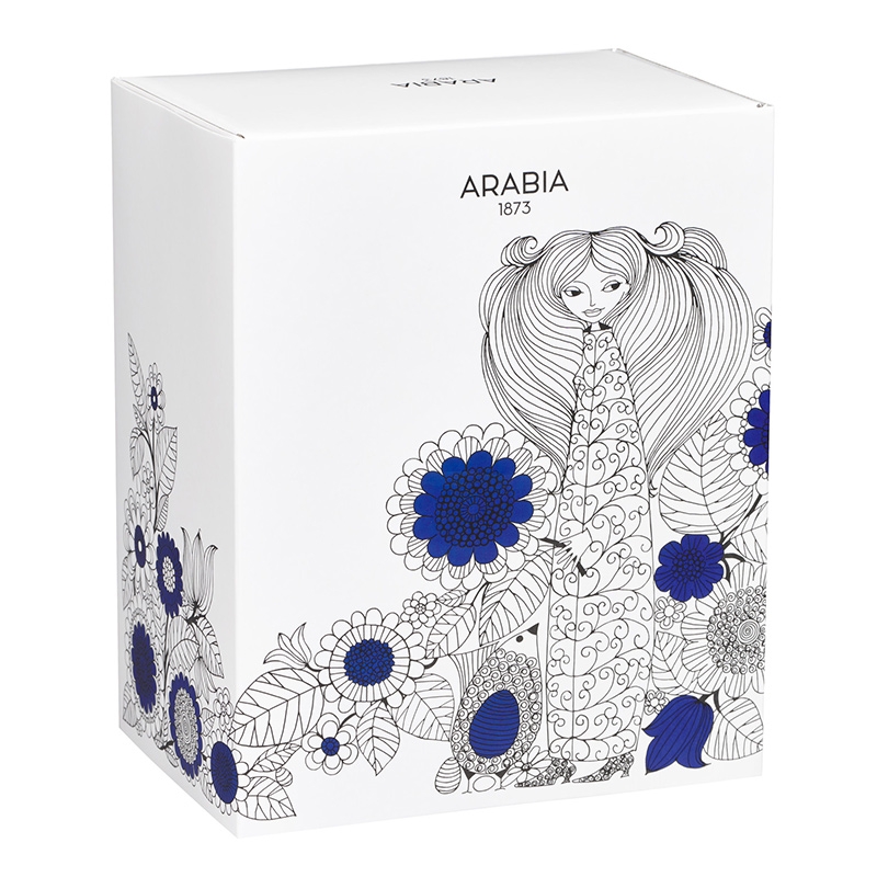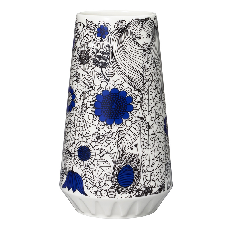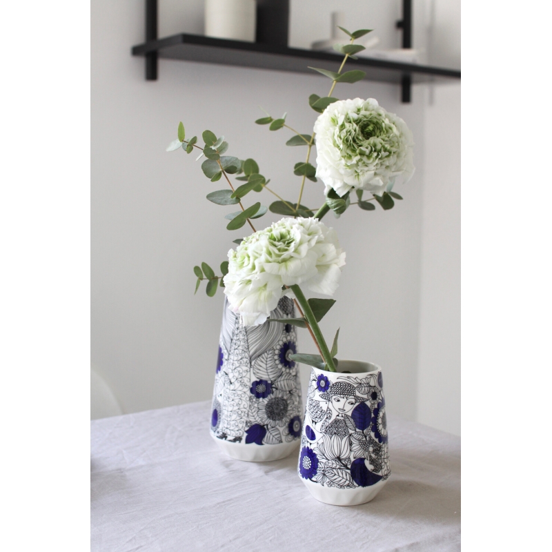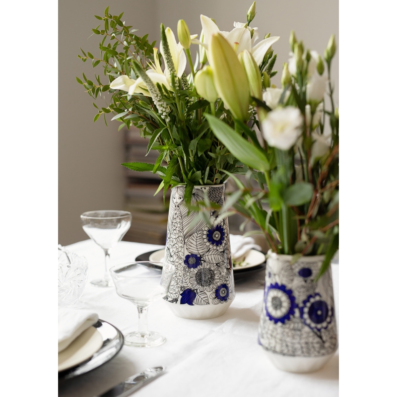 Porcelain vase from the classic Pastoraali collection, designed by long-time designer of the Finnish porcelain company Arabia Esteri Tomula. Black and white illustrations with contrasting blue elements are full of details. Simply timeless porcelain that will make you happy every day.