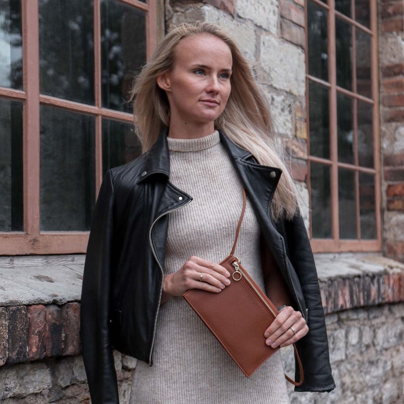 Brown Piilo handbag made of genuine elk leather with gold metal zippers and a long shoulder strap easily holds your phone, wallet, keys and other essentials. The handbag has two zippered pockets and an additional non-zippered pocket between them. The elegant design is suitable for both everyday wear and special occasions . Elk leather is soft, authentic and sustainable, and its quality remains excellent over the long term. The leather comes from wild elk and is a by-product of appropriate elk population regulation.