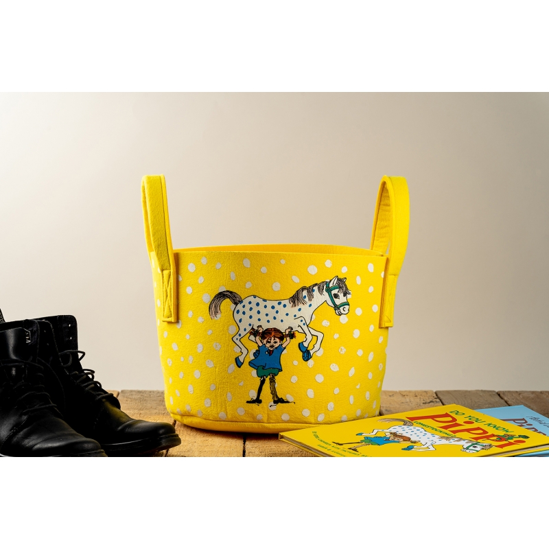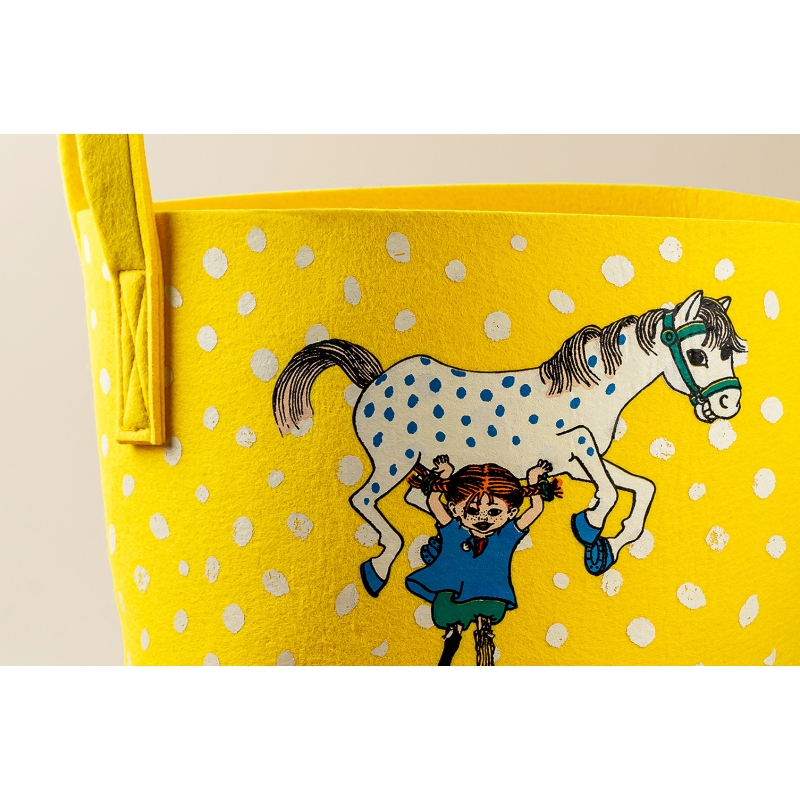 Felt multifunctional storage basket with a motif of the legendary character Pippi Longstocking and her horse Alfred, written by Astrid Lindgren and her illustrator Ingrid Vang Nyman.