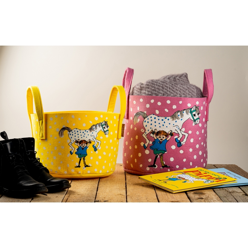 Felt multifunctional storage basket with a motif of the legendary character Pippi Longstocking and her horse Alfred, written by Astrid Lindgren and her illustrator Ingrid Vang Nyman.