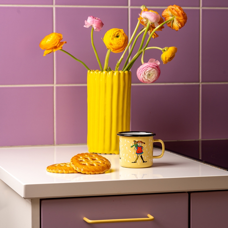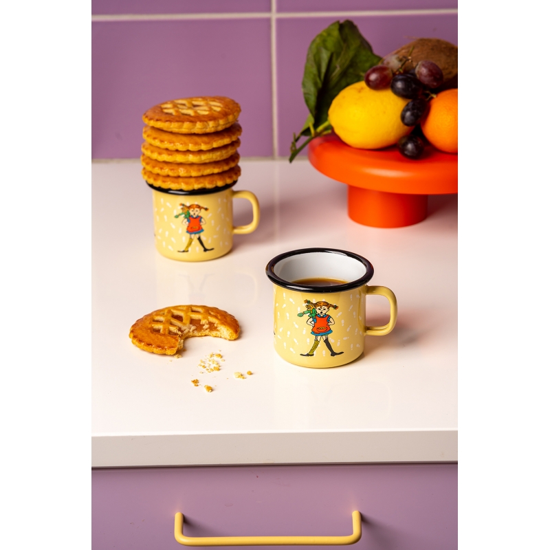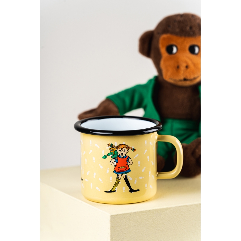 Beautiful enamel mug with the motif of the legendary character Pippi Longstocking from the pen of Astrid Lindgren and her illustrator Ingrid Vang Nyman. Pippi and her monkey Mr. Nilsson set off on a new adventure.