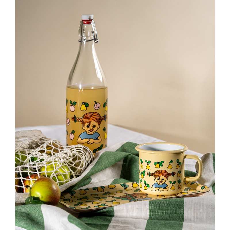 A glass bottle featuring the legendary Pippi Longstocking from the stories by Astrid Lindgren and illustrations by Ingrid Vang Nyman. This time, Pippi is surrounded by a rich harvest of pears and apples from the garden of Villa Villekulla – her magical home full of adventures.