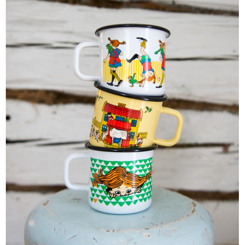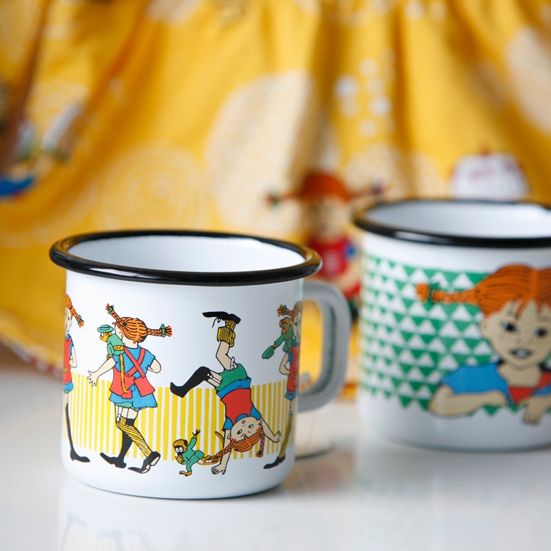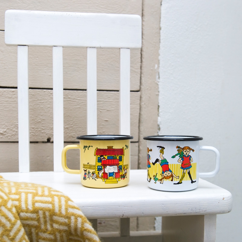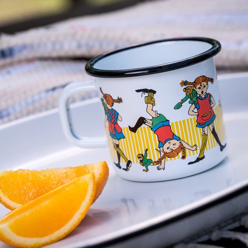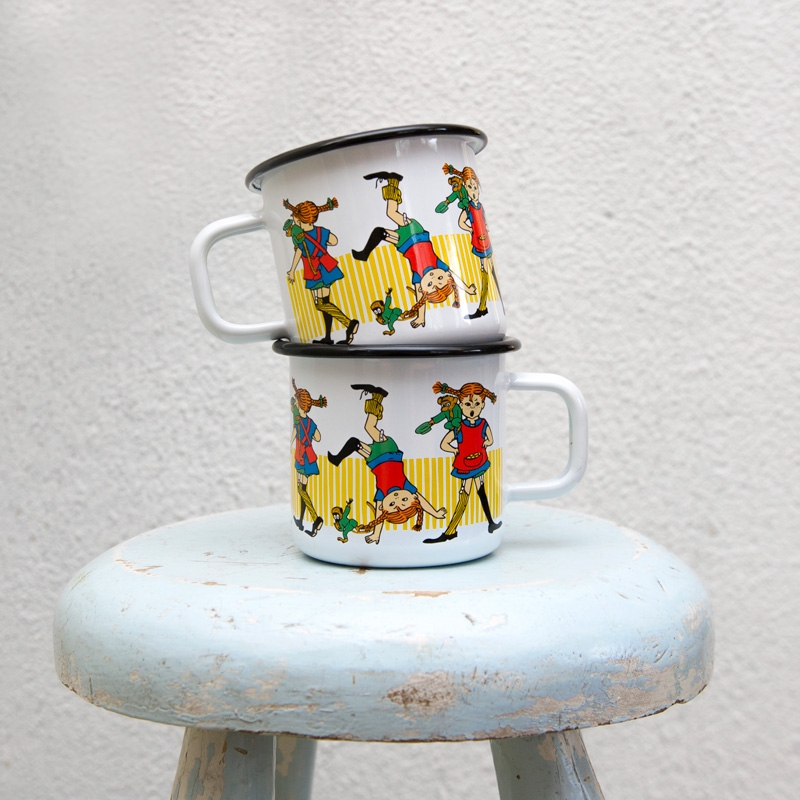 A beautiful enamel mug with the motif of the legendary character Pippi Longstocking, written by Astrid Lindgren and her illustrator Ingrid Vang Nyman. The child resident of the abandoned villa Vilekuly experiences many adventures with the children from the neighborhood, which have been loved by children and adults all over the world.