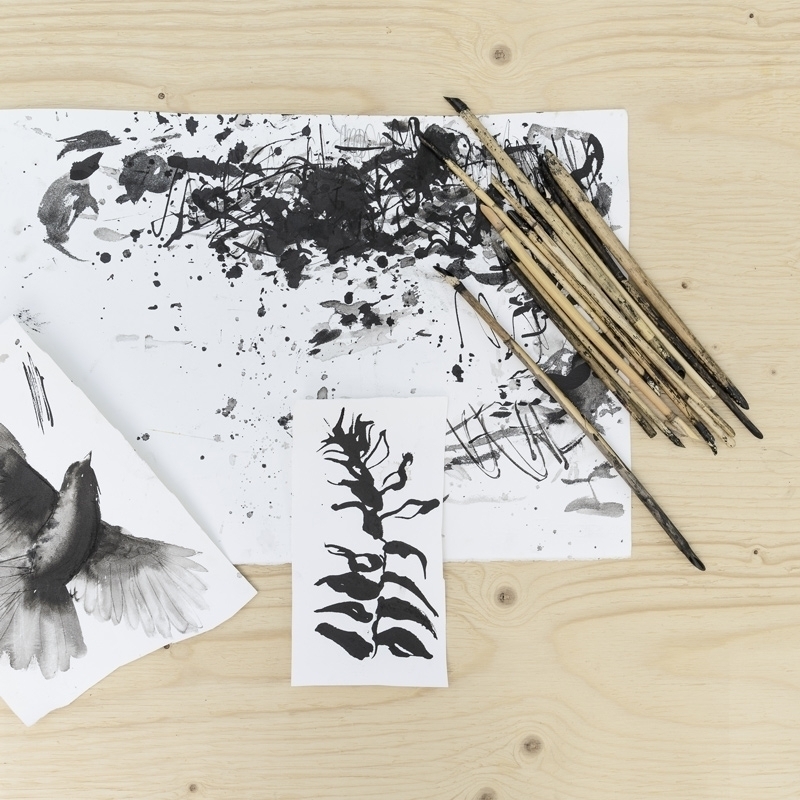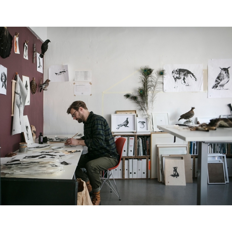 Teemu Järvi is a Finnish artist who draws his main inspiration from the untamed Nordic nature. He spends most of the year in Finnish forests to capture the life and movement of his painting subjects as authentically as possible. He works with traditional drawing methods, such as painting with a reed stem and Chinese ink. At first glance, his seemingly simple paintings reveal a wealth of carefully thought-out strokes upon closer inspection.