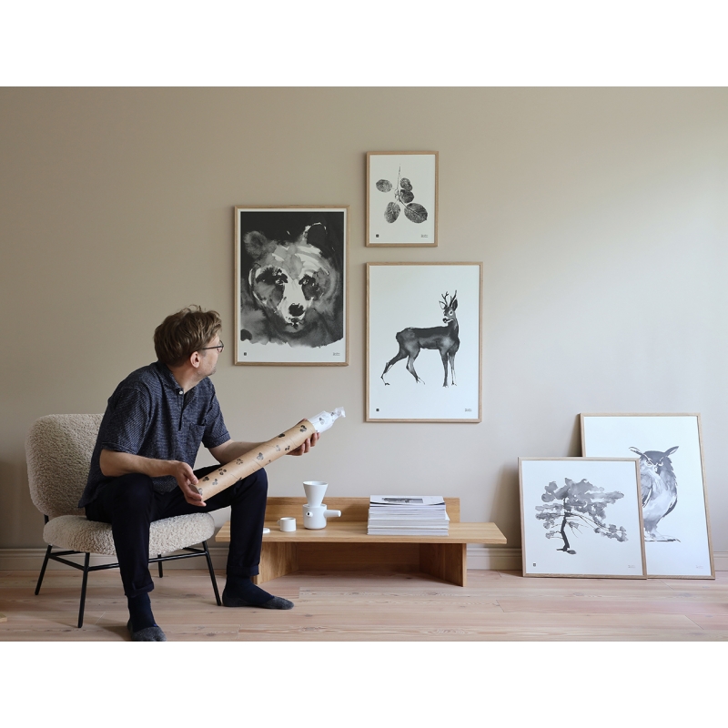 The poster featuring the Roe Deer motif by Finnish artist Teemu Järvi takes you into the heart of the wild Nordic nature. This beautiful black-and-white poster is a perfect addition to interiors, especially in the Scandinavian style. The delicate strokes of the bamboo pen, crafted with meticulous detail, will captivate you at first glance. You can hang the framed poster on the wall, place it leaning on a dresser or nightstand, or for those embracing the Scandinavian design aesthetic, pin it directly to the wall without a frame. The poster comes unframed in a gift cardboard tube.