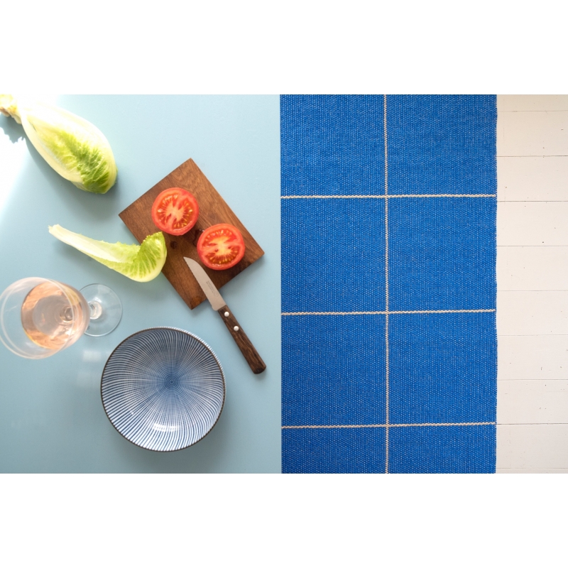 The Ruth double-sided hand-knitted piece rug is a striking blue with thin beige lines on one side and a soft beige shade on the other in reverse colors. A great rug if you sometimes want to completely change the atmosphere.