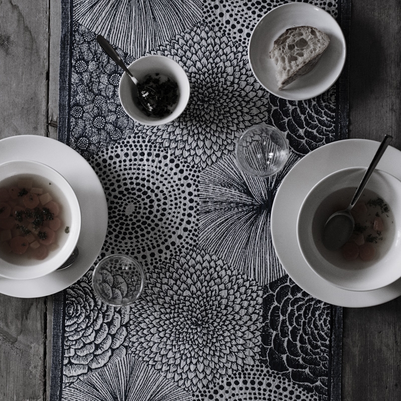 The Ruut table runner with a very interesting floral pattern in black and white will catch your eye at first sight. The simple pattern hides a number of details that ultimately create a harmonious, eye-pleasing whole. It fits perfectly not only in Scandinavian-style dining rooms, but also in traditional vintage-style ones. The neutral black and white color of the runner looks harmonious and, combined with the floral pattern, will subtly enliven your dining room.