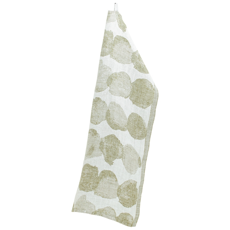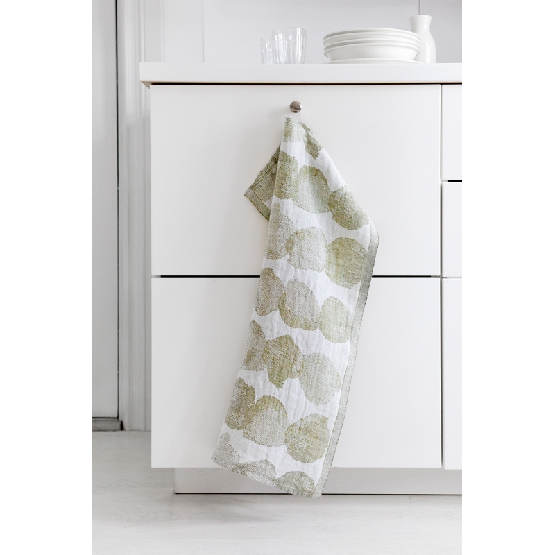 The Sade towel is woven from 100% linen and features a snowball-inspired pattern in olive green, designed for Lapuan Kankurit by Japanese designer Aoi Yoshizawa. Linen dries quickly and feels nice on the skin, so you can use the large towel not only in the bathroom for drying off, but also as a simple kilt by wrapping it around your waist in the sauna. It also works great as a beach towel for the sea.