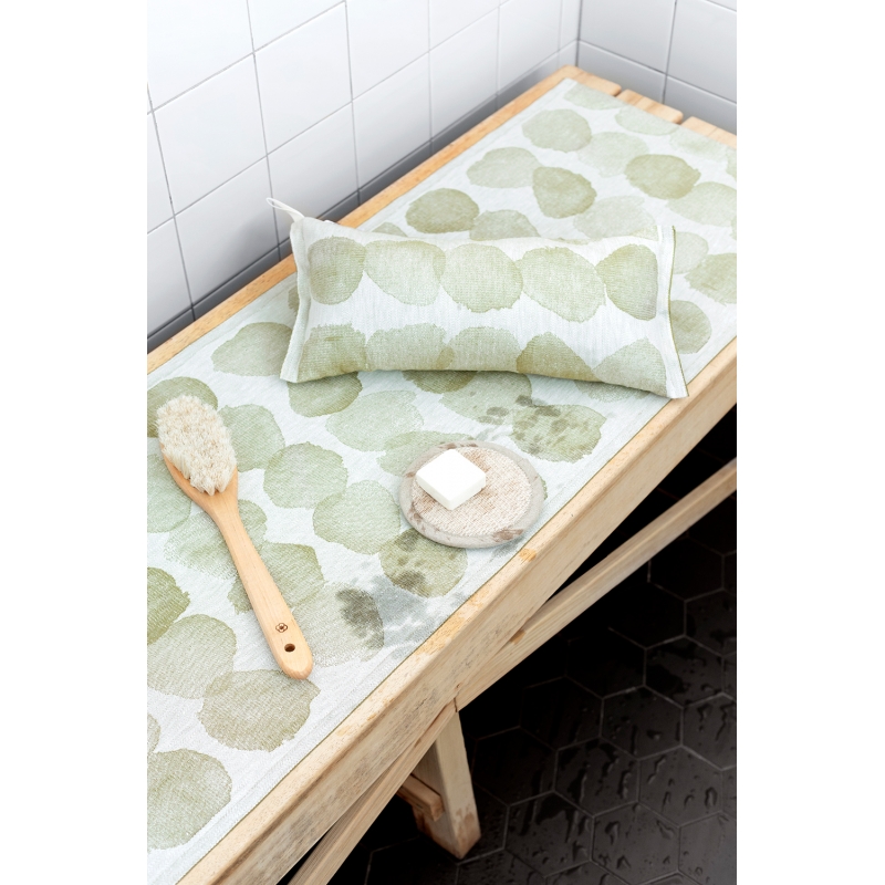 The Sade sitting sauna set in olive green features a snow globe-inspired pattern designed for Lapuan Kankurit by Japanese designer Aoi Yoshizawa. The set will increase your comfort and improve hygiene during sauna use. The set includes a short mat and a pillow.