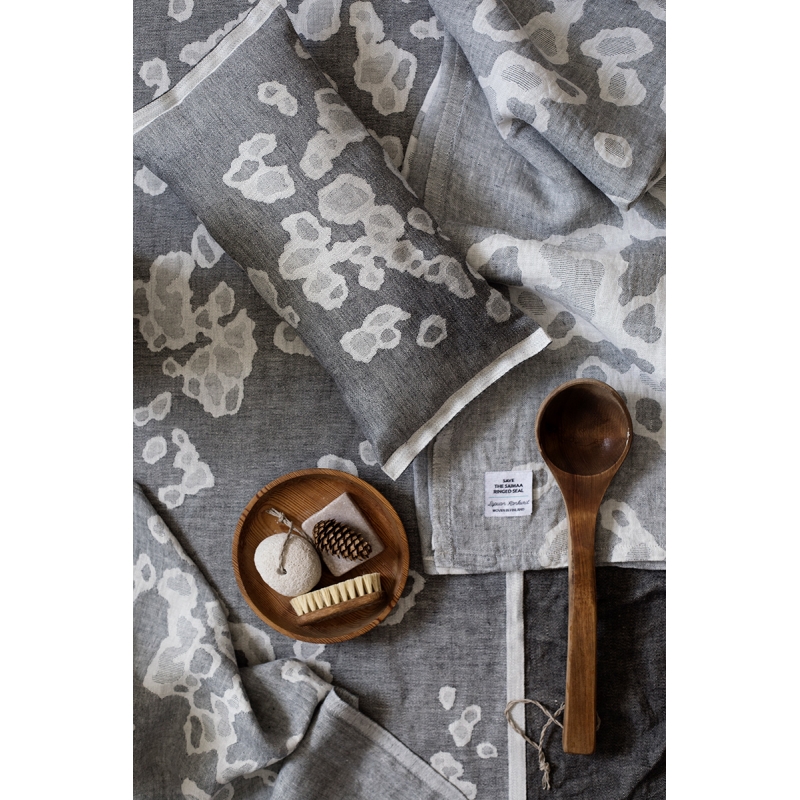 A sauna set for sitting, woven from linen and organic cotton, with a motif inspired by the fur of the ringed seal. The pattern was not chosen by chance, the Saimaa ringed seal is an endangered species that lives exclusively in Lake Saimaa in Finland and there are only 400 individuals left in the world. Lapuan Kankurit has decided to support the rescue of this beautiful creature and part of the profit from the Saimaannorppa collection goes to the Finnish Nature Conservation Association.