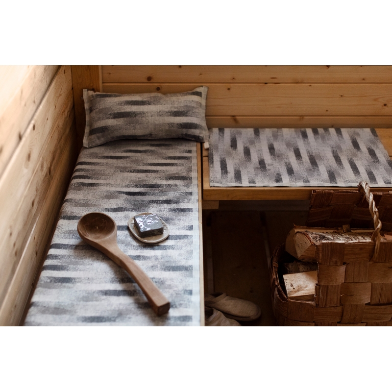 The short sauna bench pad features the Hohto pattern in grey. The motif is inspired by trees with rays of sunlight shining through. The pad in fresh colours will increase your comfort and improve hygiene when using the sauna. It is suitable not only for sitting, but also as a foot pad in a public sauna.