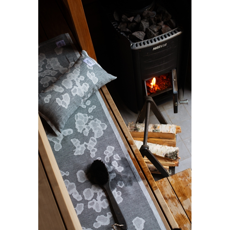 A sauna mat for lying down, woven from linen and organic cotton, with a motif inspired by the fur of the ringed seal. The pattern was not chosen by chance, the Saimaa ringed seal is an endangered species that lives exclusively in Lake Saimaa in Finland and there are only 400 individuals left in the world. Lapuan Kankurit has decided to support the rescue of this beautiful creature and part of the profit from the Saimaannorppa collection goes to the Finnish Nature Conservation Association.