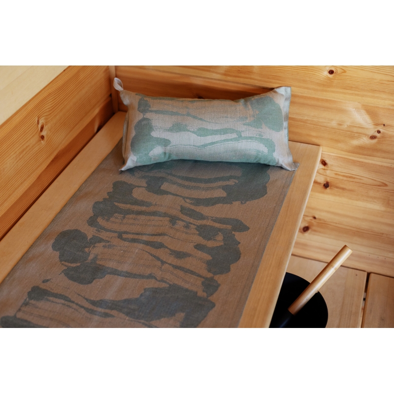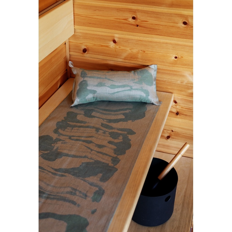 The Savu reclining sauna set is inspired by the authentic atmosphere of a traditional Finnish smoke sauna. Finnish designer Heini Turunen focused on a multi-sensory experience when designing it – the scent of smoke, the softness of the healing steam and the rustic beauty of the patina on the wooden benches. The set includes a long mat and a pillow.