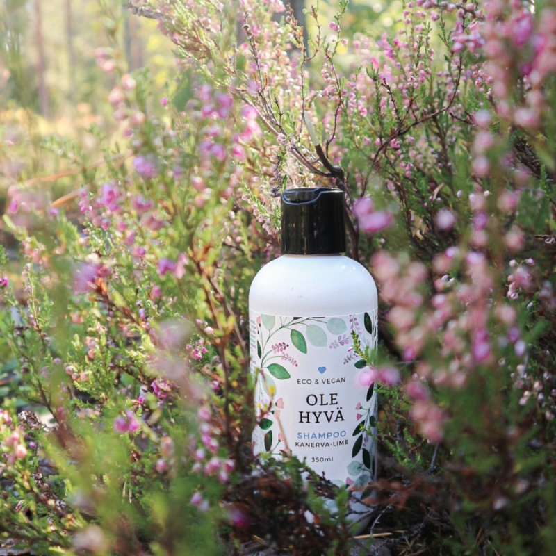 The shampoo is made in Finland using renewable resources and without unnecessary environmental impact by the Ole Hyvä brand, which focuses on eco-friendly cosmetics and plant-based cleaning products.
