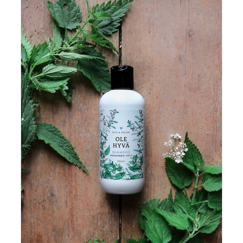 The shampoo is made in Finland using renewable resources and without unnecessary environmental impact by the Ole Hyvä brand, which focuses on eco-friendly cosmetics and plant-based cleaning products.