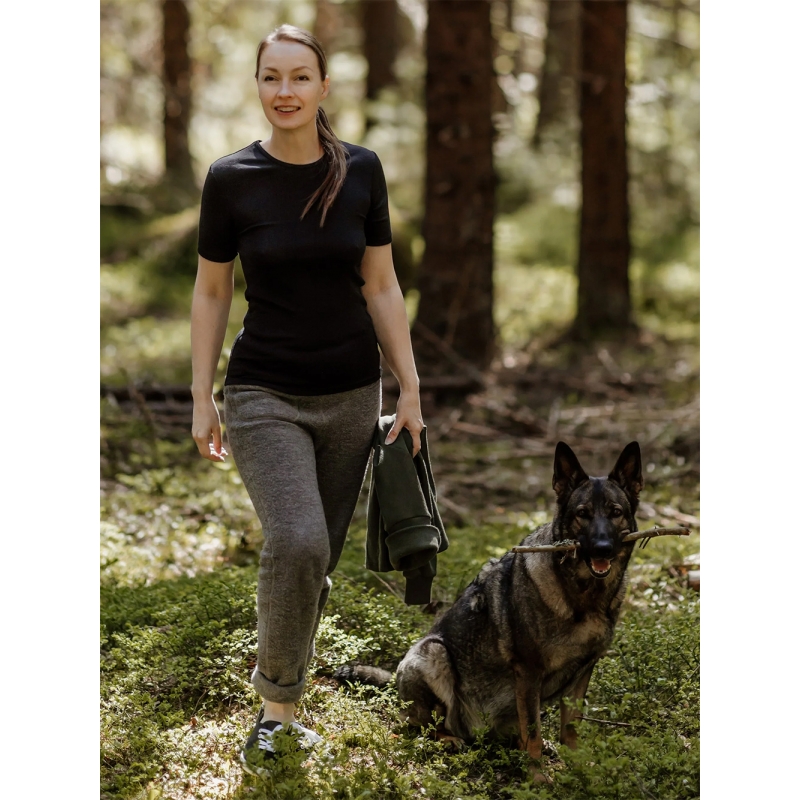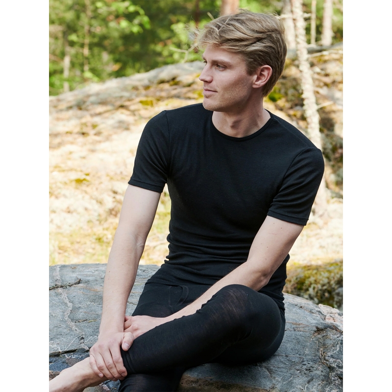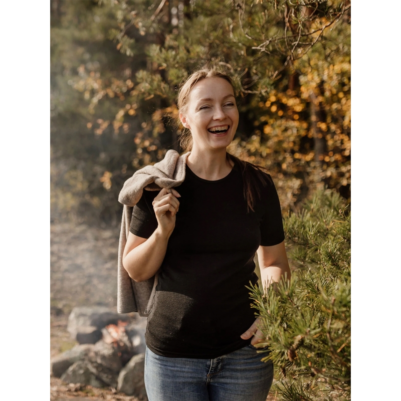 A short-sleeved T-shirt made from a fine blend of organic merino wool and natural silk provides exceptional comfort all year round – pleasantly cool in summer, reliably warm in winter. The light, breathable knit adapts naturally to the body, wicks away moisture well and remains dry to the touch even in variable temperatures. Thanks to its softness, it is ideal as a first layer for everyday wear, in nature, for moments of relaxation and as pajamas.