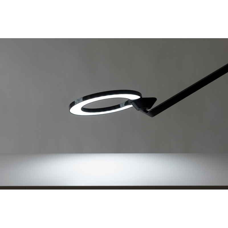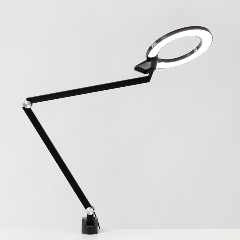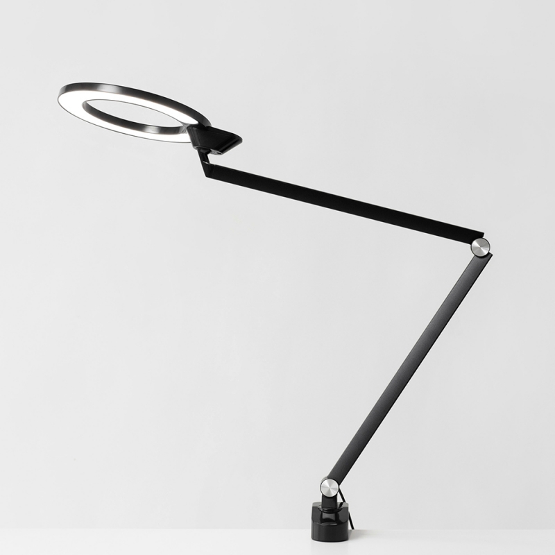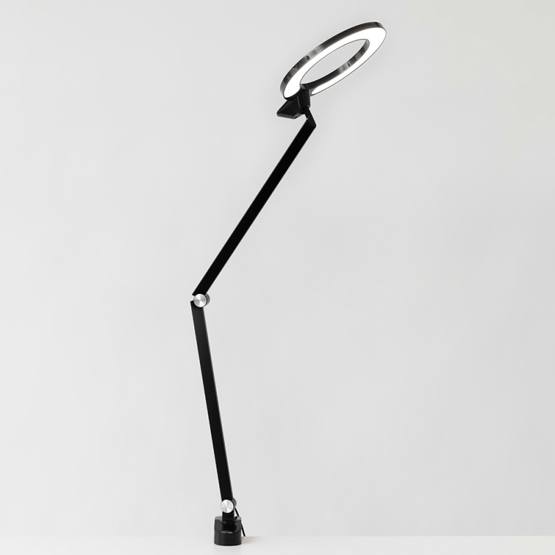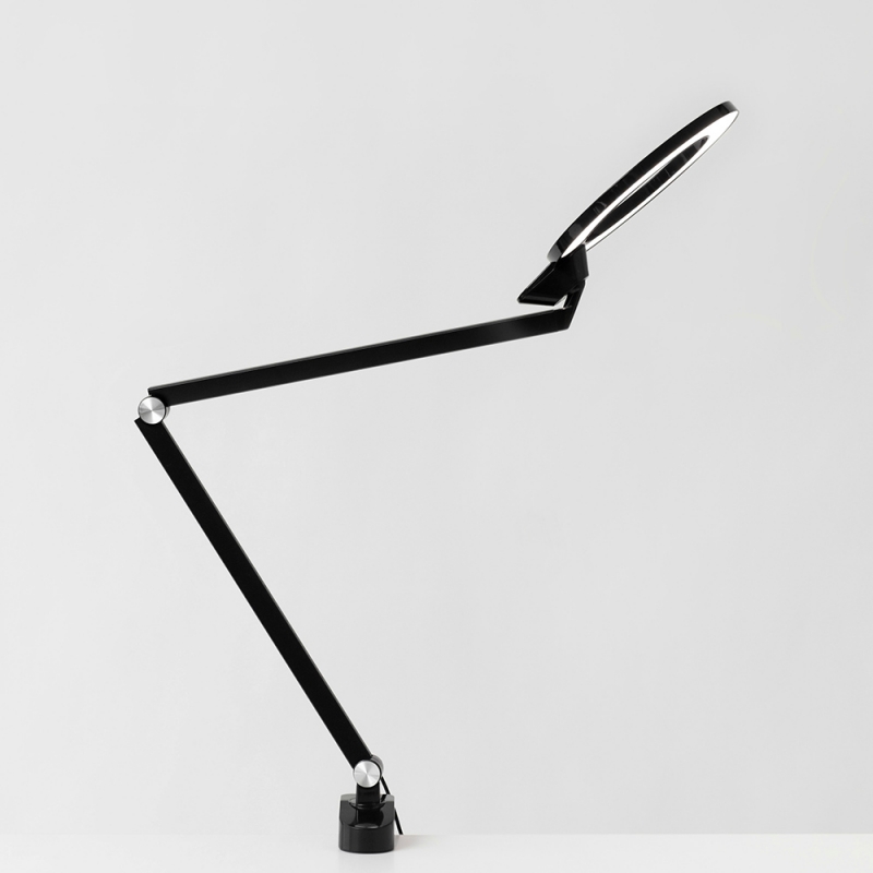 This version of the lamp does not have a classic base but a handle for attaching to a work desk.