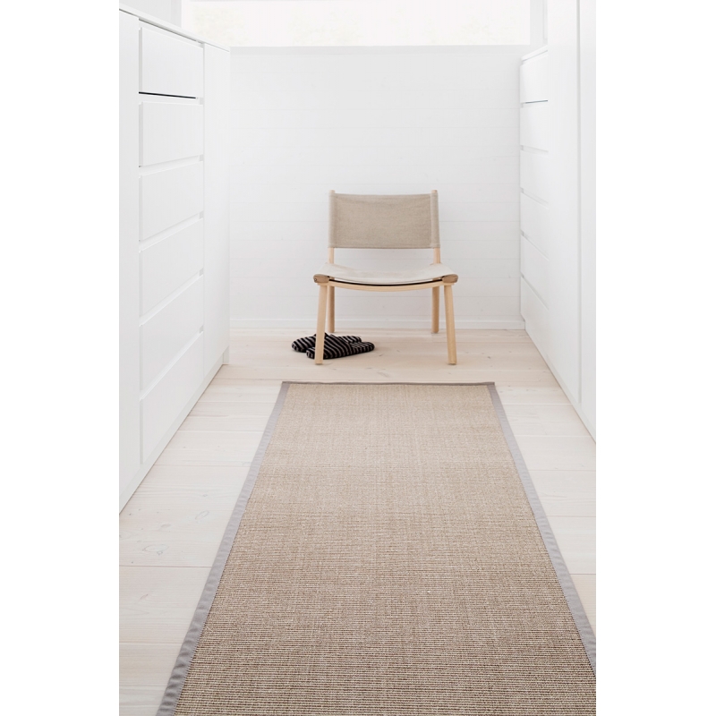 Sisal piece carpet made of natural agave fibers with a fine pattern. Sisal rugs are durable and you can rely on them even in exposed areas such as entrance halls or hallways. The back of the carpet is covered with a special anti-slip layer. Thanks to this, the carpet holds its shape firmly and does not wrinkle, protecting not only you from slipping, but also the floor itself from scratches. In addition, it does not let dust penetrate under the carpet, which only needs to be vacuumed from the top. VM-Carpet carpets are also suitable for rooms with underfloor heating.