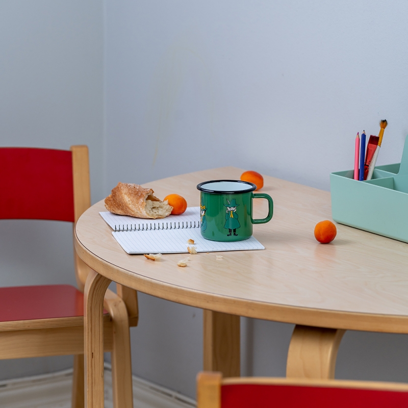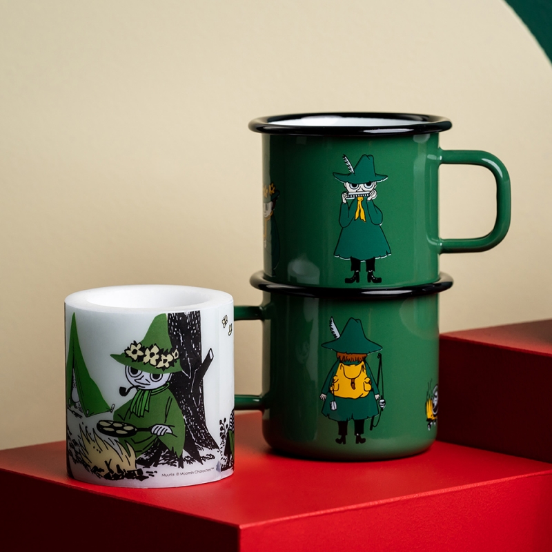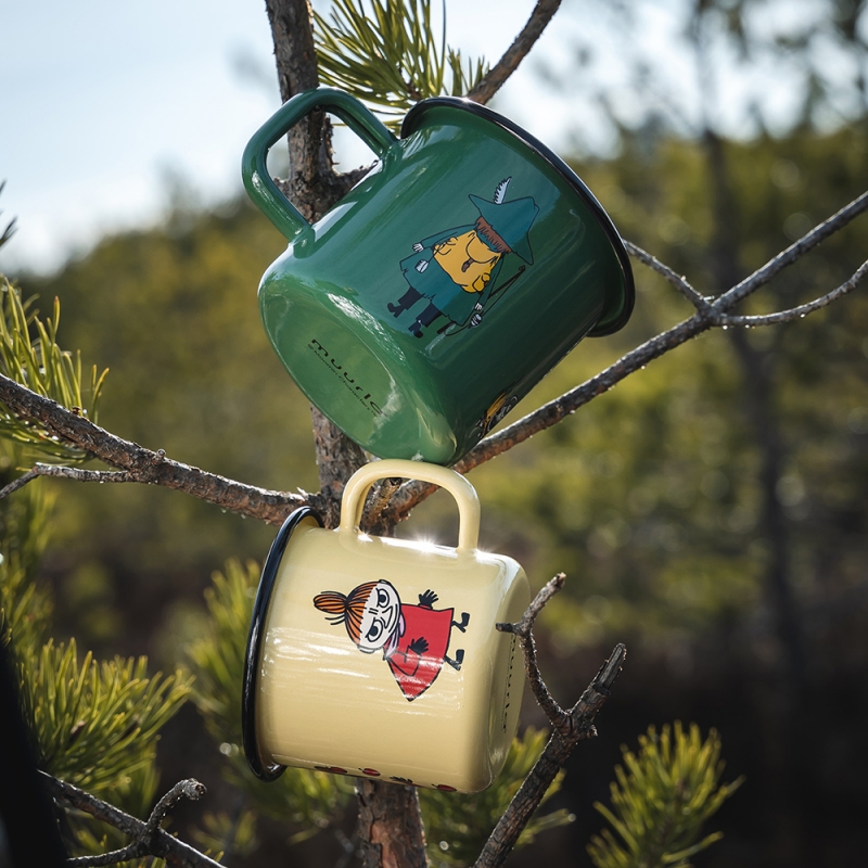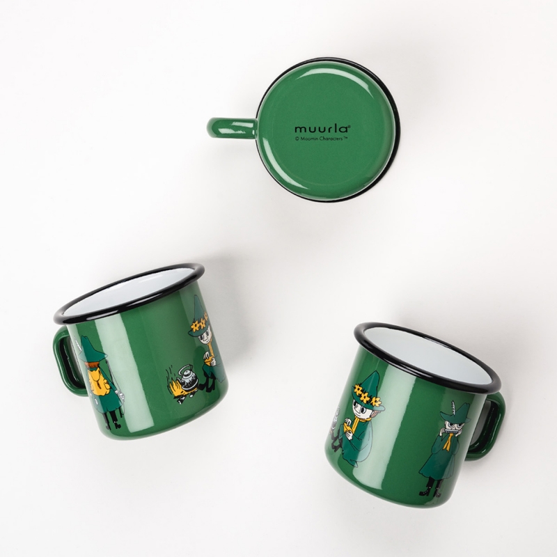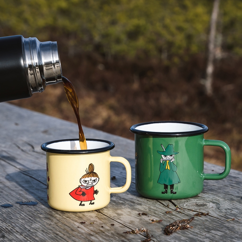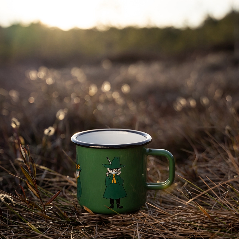 A lovely enamel mug based on the Moomin fairy tale by the famous Finnish author Tove Jansson. Snufkin is a melancholic character who wanders the world, fishing and playing his famous harmonica. He carries all his things in his backpack because he believes that the more you own, the more complicated your life becomes.