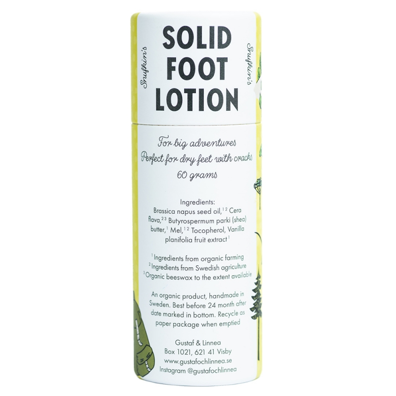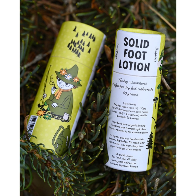 Natural solid foot lotion with the motif of Snufkin from the popular Moomin fairy tales is made in the Swedish Gustaf och Linnea manufactory and combines gentle skin care with a sustainable approach to nature.