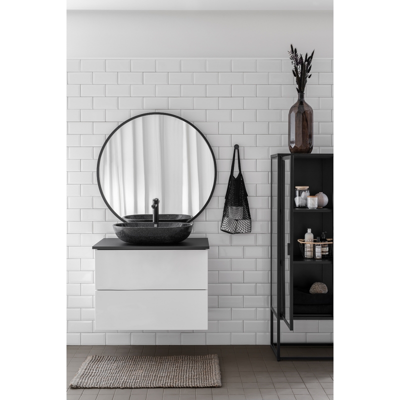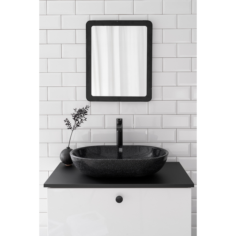 The size of the sink is ideal for a bathroom or toilet, not only in homes but also in commercial spaces. This model is designed to be placed on a cabinet or countertop and is without an overflow and a tap hole, which is placed next to the sink or in the wall above it. The char shade is an elegant black tone with a glossy surface.