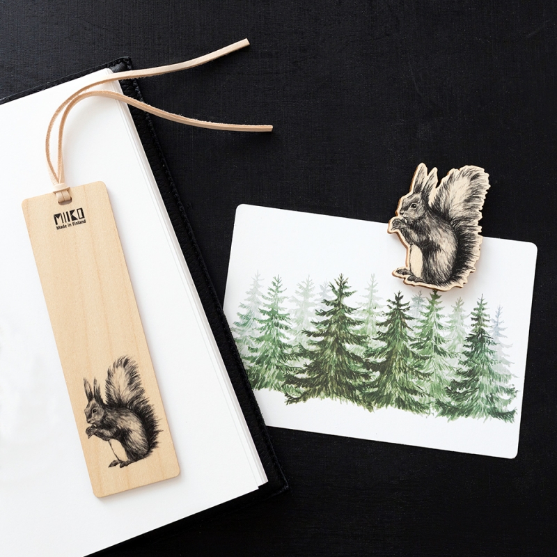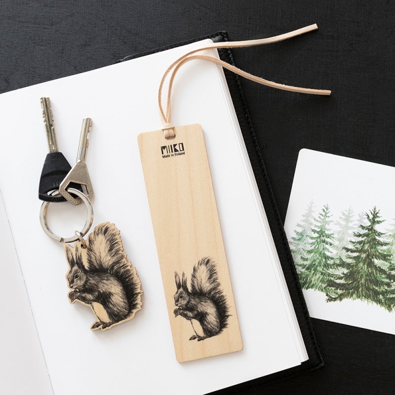 This high-quality squirrel-themed bookmark is a beautiful and practical addition to any nature-loving reader's collection. Made in Finland from eco-friendly Finnish birch plywood and reindeer leather.