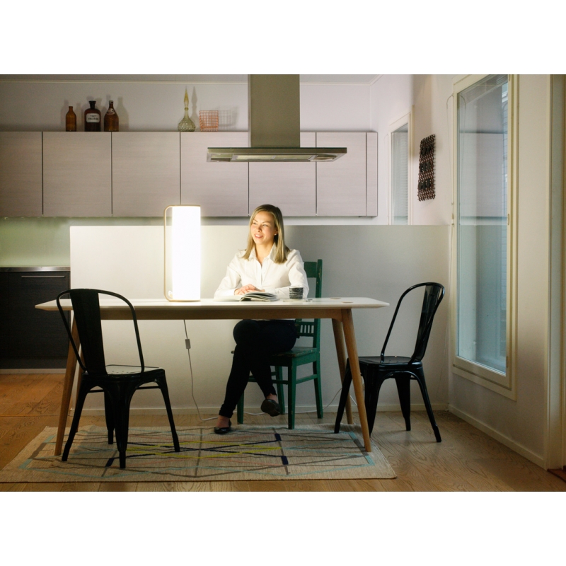 The lamp is part of the Bright Therapy collection of therapeutic lamps, which, based on scientific studies, compensate for daylight and help overcome short winter days. The lamp has a dimmer with the ability to adjust the light intensity.