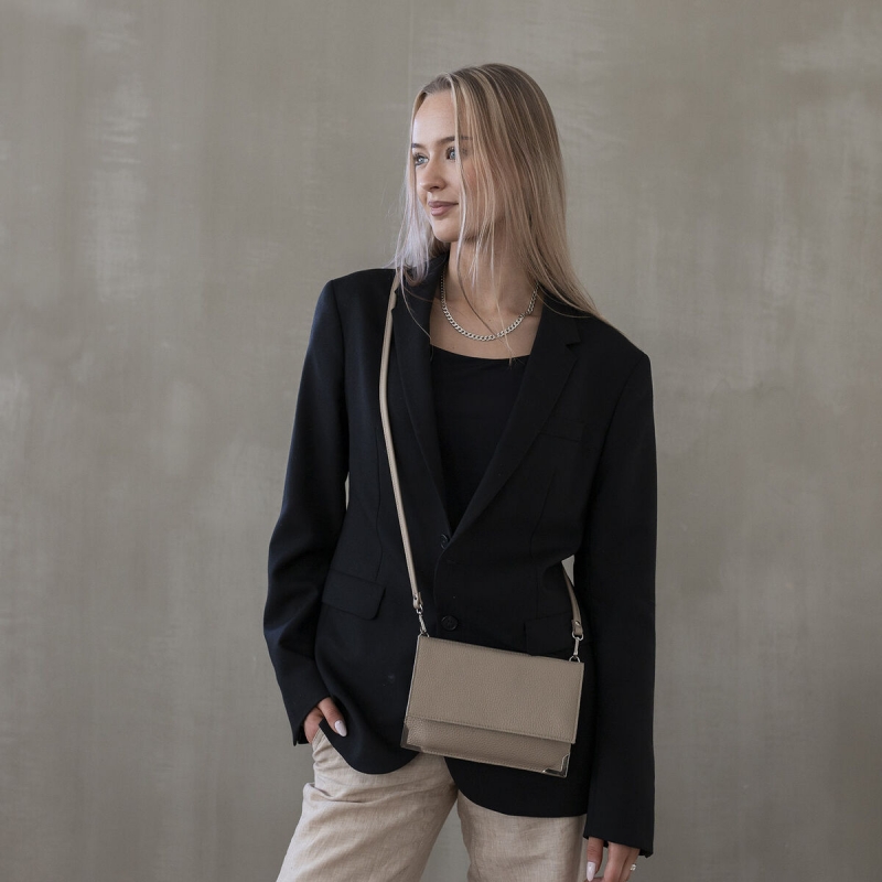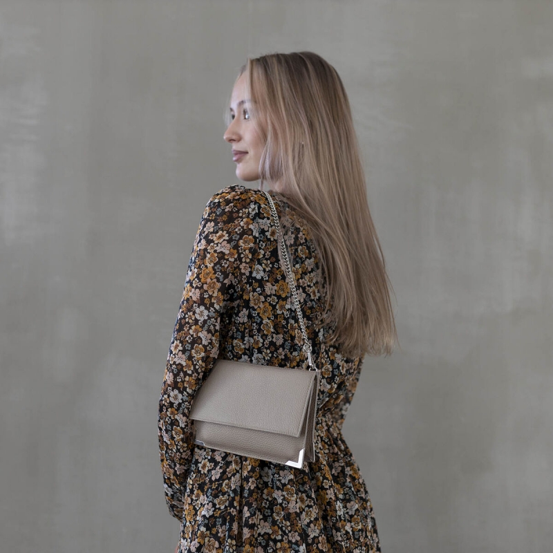 The stylish Välke handbag made of genuine elk leather is the perfect companion for both everyday and more formal outfits. It is designed to provide just the right amount of space for your mobile phone, wallet, keys and a few small items. The handbag comes with a leather and chain strap, which allows you to easily change your style. The handbag fastens with a zipper and has two compartments inside, separated by another pocket. The bottom of the handbag is protected by metal corners, which add to its exclusivity.