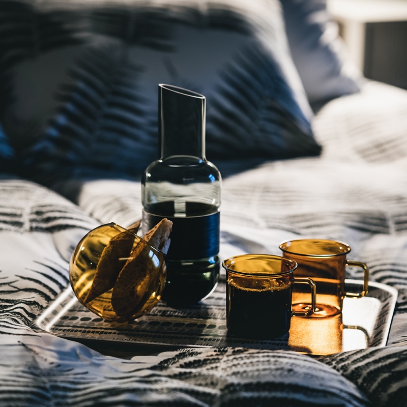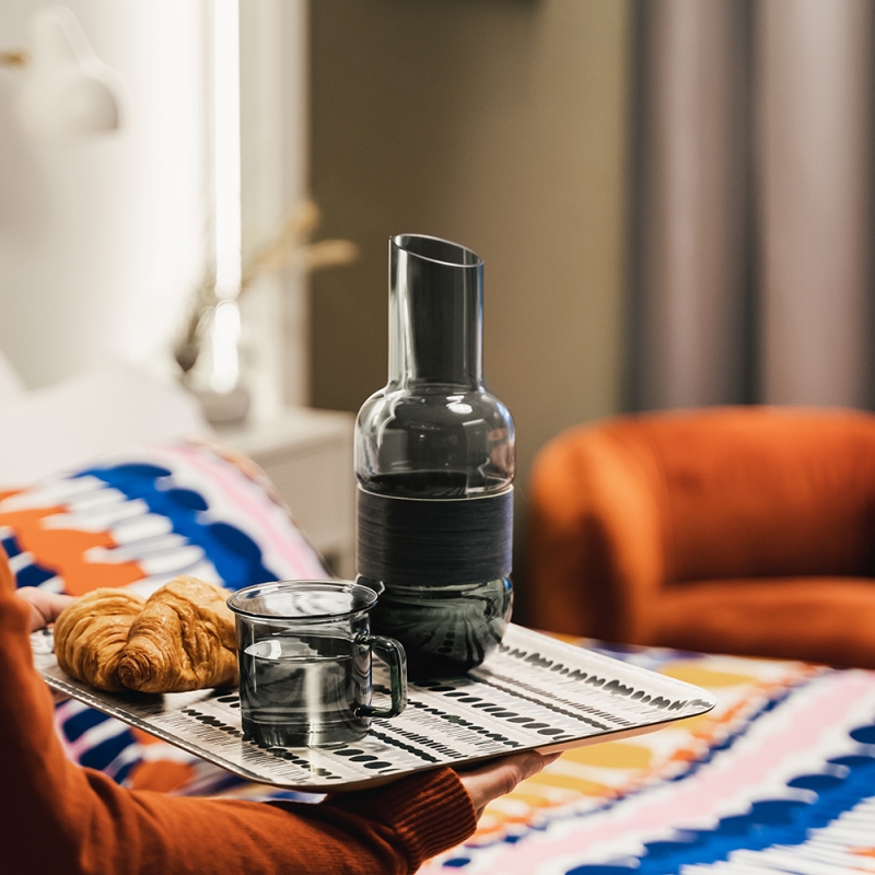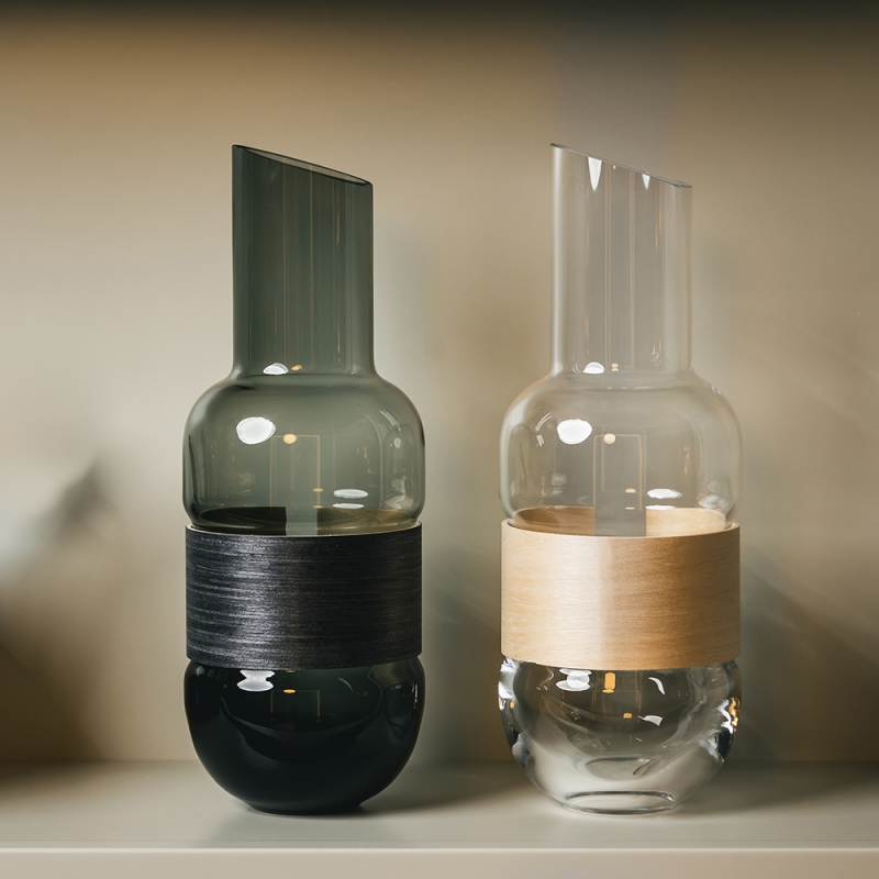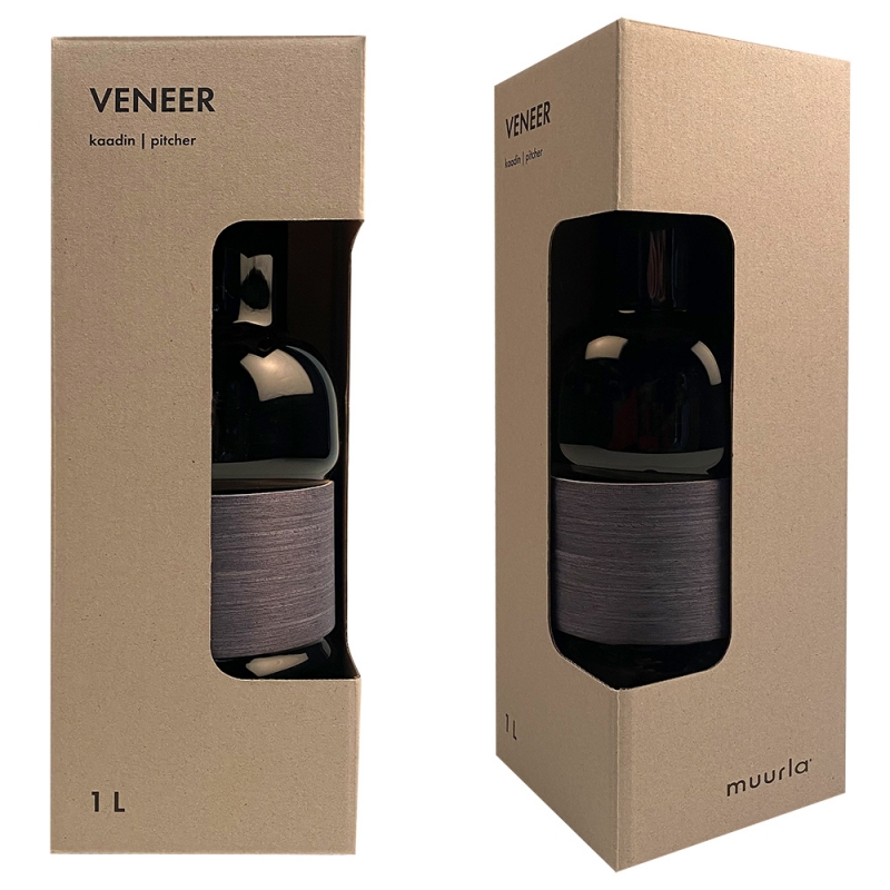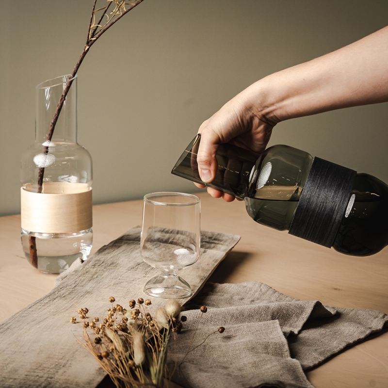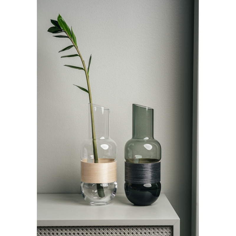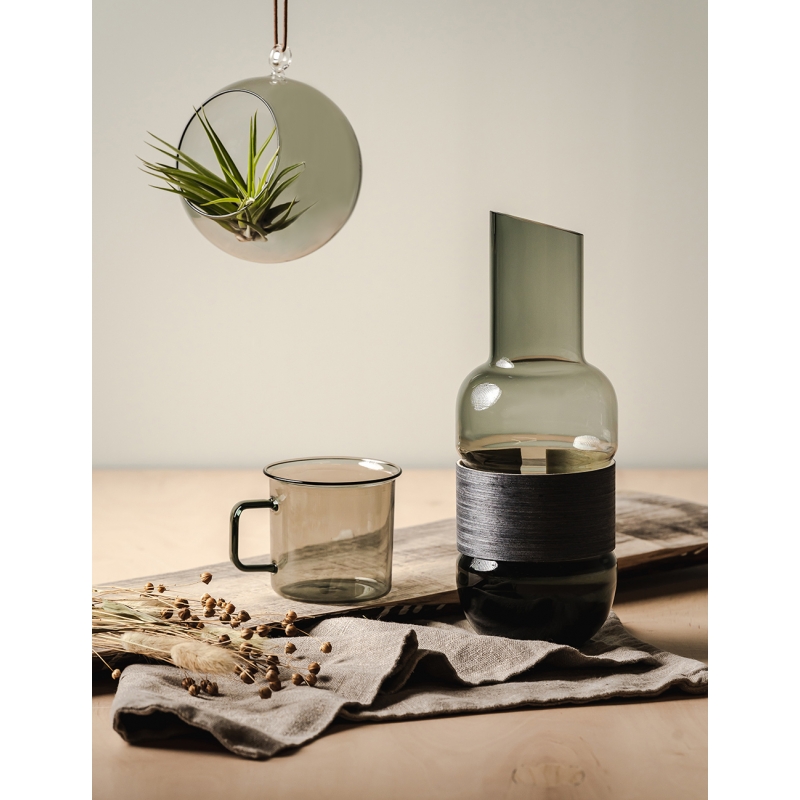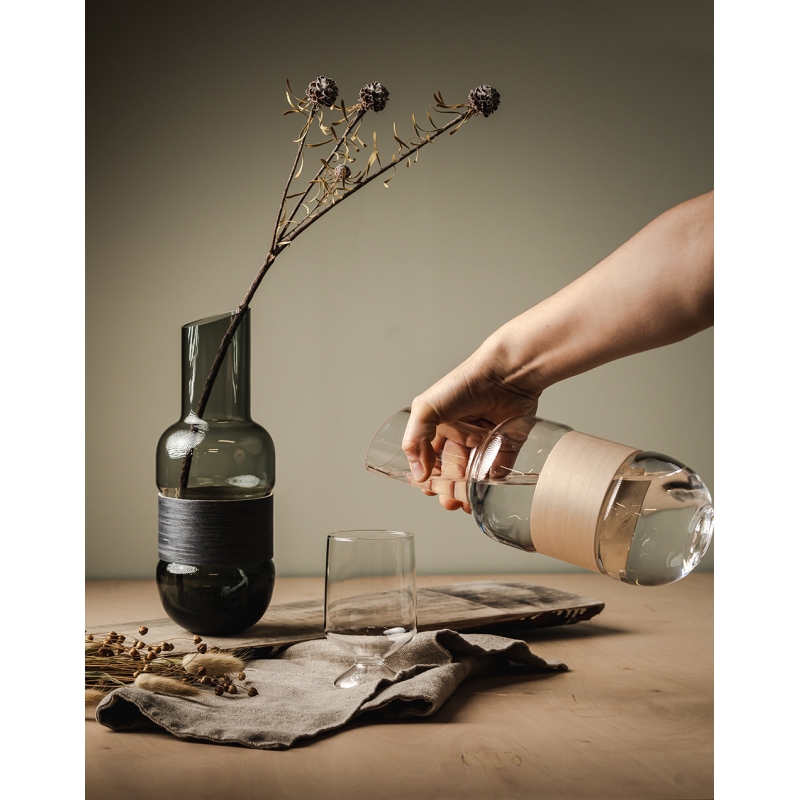 A modern carafe made of dark grey glass is surrounded by birch plywood, creating a beautiful design piece. The carafe will brighten up your dining table and, in addition to serving drinks, you can also use it as a stylish vase. Thanks to its handmade nature, each piece is original and the carafe is packaged in a gift box, making it a nice gift for lovers of quality Nordic design.