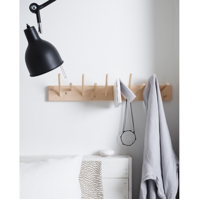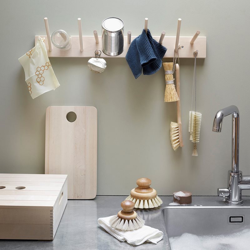 The universal hanger made of solid birch wood has a total of 13 hooks in three sizes and angles. You can hang bath towels, hand towels and washcloths on it in the bathroom and it is also ideal placed by the kitchen sink for brushes, cloths, accessories and also for drying sorted waste.