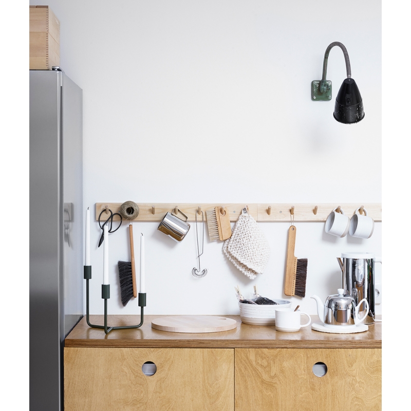 The universal hanger made of solid birch wood with 7 hooks is suitable for the kitchen, hallway and bathroom. You can hang bath towels, hand towels and washcloths on it in the bathroom and it is also ideal for hanging brushes, cloths and kitchen utensils by the kitchen sink. The distance between the hooks is the same even when placing several hangers next to each other, which allows you to extend the hanger to the desired length.