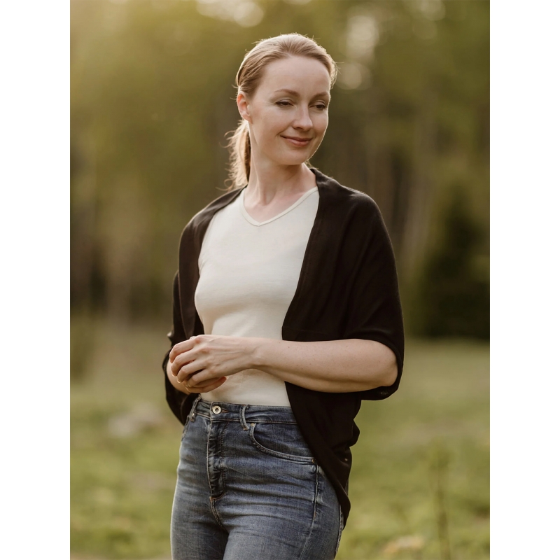 An elegant cardigan made of fine knit organic silk and merino wool will become your universal companion – whether you wear it with a dress, to the office, on the patio or as a warm layer on the go. The combination of natural silk and merino wool offers the best of both worlds: silky softness and natural thermal comfort.