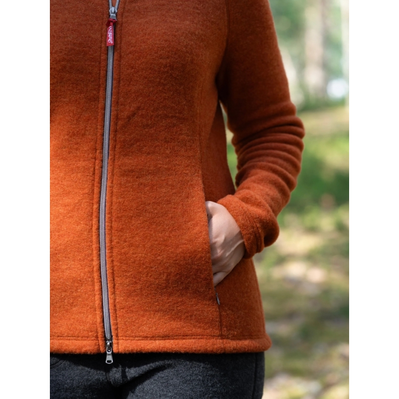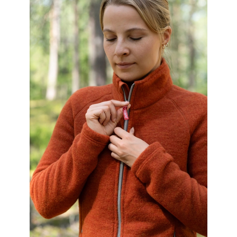 The women's cut with a two-way zipper, two practical zipper pockets and two inner pockets made of fine organic cotton knit guarantees comfort and functionality. The pure wool fleece does not contain any synthetic fibers, and therefore no microplastics, and is naturally fire-resistant. In addition, the wool neutralizes odors and often only needs to be aired out - washing is not necessary after each wear.