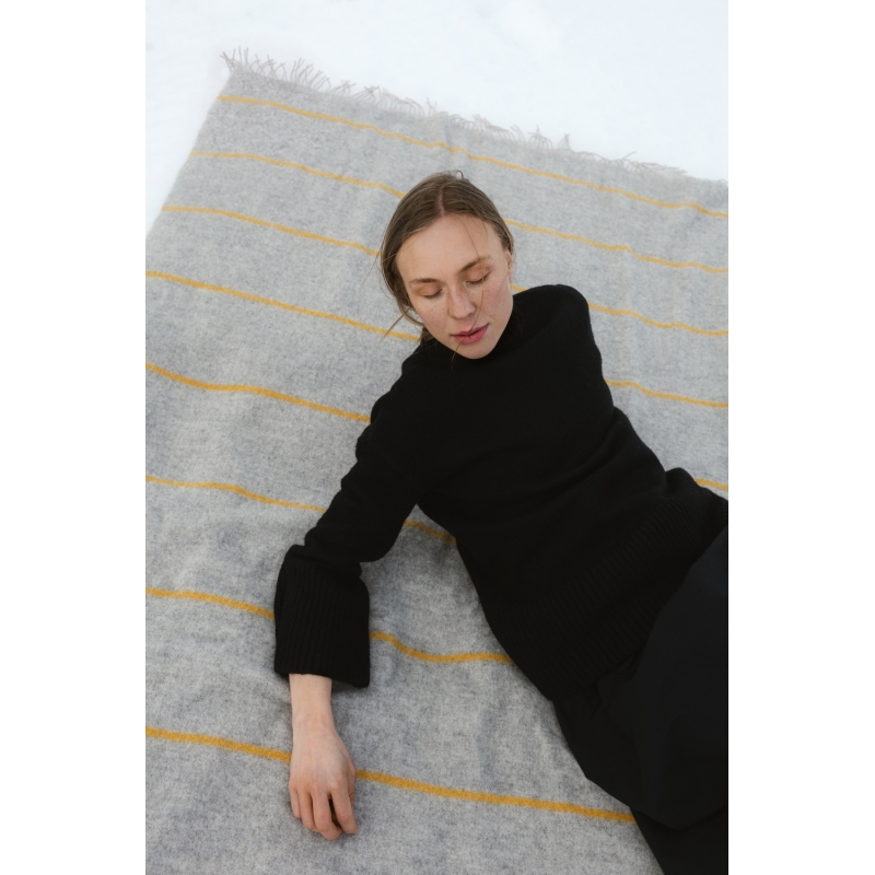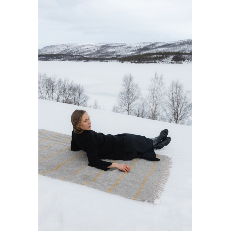 The Halla blanket is made in Finland from high-quality wool of Finnsheep combined with certified New Zealand wool. The soft natural beige tone is complemented by subtle lines and finished with elegant fringes on the sides. The wool fiber of this blanket is dyed with a vegetable dye obtained from coffee from surpluses from a Finnish roastery Paulig.