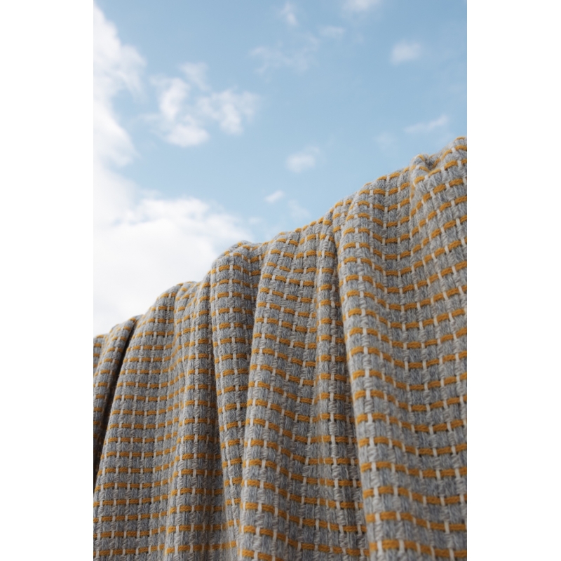 The Havas wool blanket by designer Heta Vajavaara combines tradition and playfulness. It is based on a classic weaving structure that Heta discovered in her personal library of weaves and brought to life with a rhythmic geometric pattern. By combining yarns of different colours and grouping them together, a lively motif is created that attracts attention without disturbing the calm of the interior. The wool fiber of this blanket is dyed with a vegetable dye obtained from coffee from surpluses from a Finnish roastery Paulig.