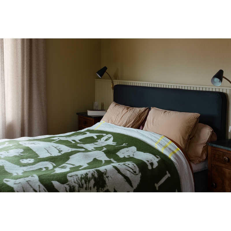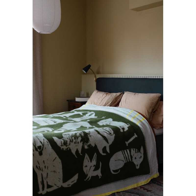 The olive green Koirapuisto blanket made of 100% pure wool with a playful dog motif will beautifully create a cozy atmosphere in any interior. It will delight not only every dog lover who loves to snuggle up in it. On one side, the blanket is dark with a light pattern, on the other, on the contrary, there is a light background and a dark pattern.