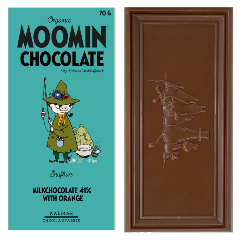 Švédska bio mliečna čokoláda z rodinnej čokoládovne Kalmar Chokladfabrik spája jemnosť 41% čokolády s osviežujúcou chuťou pomaranča. Inšpirovaná Snufkinom, ktorý miluje jednoduchosť života, prináša táto čokoláda harmóniu zamatovo hladkej mliečnej chuti a sviežeho citrusového tónu.