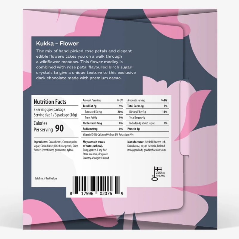 Fínska čokoládovňa Goodio používa tie najlepšie bio kakaové bôby Criollo z Peru. Bôby sa po tri dni melú na kamenných mlynoch a čokoláda tak dostáva zamatovú konzistenciu a lahodnú chuť, ktorú dovádzajú k dokonalosti ručne zbierané okvetné lístky. Všetko privádza k dokonalosti krásne dizajnové balenie, ktoré čokoládu predurčuje k darovaniu.
