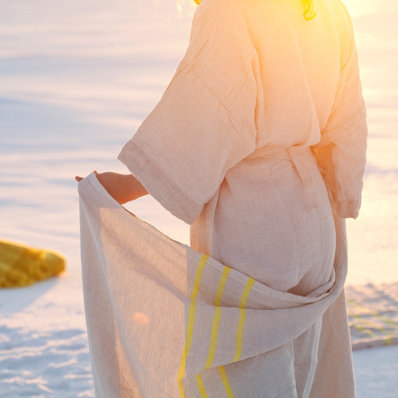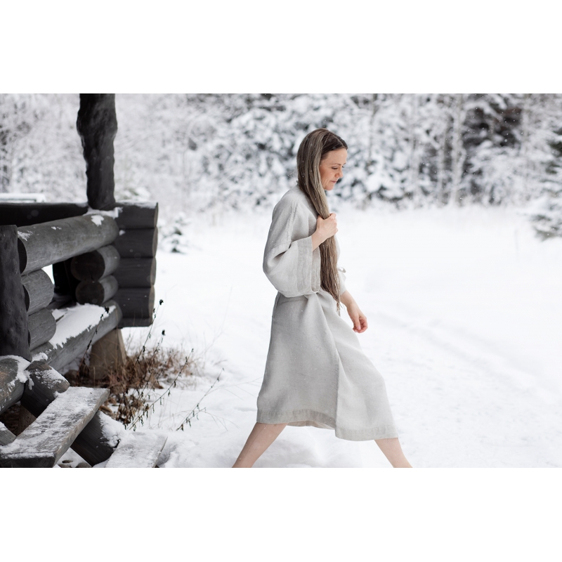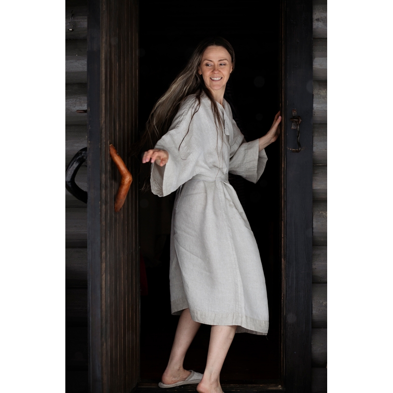 Nájdite si svoje pohodlie v príjemnom župane so 100% prírodného ľanu a užívajte si jeho ľahkosť a jemnosť. Župan Kaste je jednoducho synonymom fínskej kvality a dizajnu. Či už si ho chcete vziať so sebou do sauny, na bazén alebo na rannú prechádzku po pláži, vždy bude výborným spoločníkom.