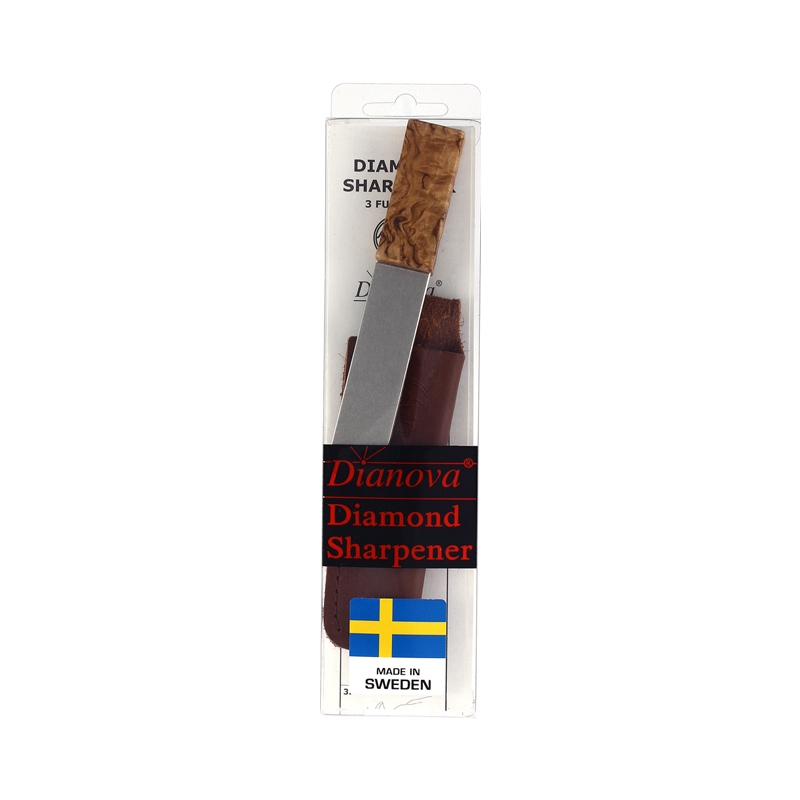 Exkluzívna švédska obojstranná diamantová brúska s rukoväťou z brezy kučeravej a s krásnym koženým puzdrom bude výrazným pomocníkom, či už ho vezmete do prírody, na lov alebo kempovanie. Diamantová brúska precízne nabrúsi lovecké, rybárske alebo outdoorové nože a nestratí sa ani v kuchyni. Na jednej strane je brúska hrubšia a na druhej jemnejšia pre detailné dobrúsenie. Úhľadný funkčný dizajn s brezovou rukoväťou necháva vyniknúť štruktúre dreva. Vďaka kompaktným rozmerom a štýlovému puzdru je skladná a môžete ju vziať prakticky kamkoľvek, kde si beriete svoj nôž.