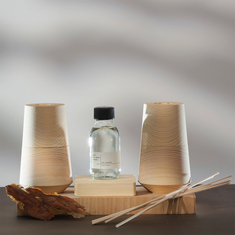 Difúzer z fínskeho borovicového dreva je krásny a vydrží na celý život. Hornú časť je možné odklopiť a vo vnútri je schovaná sklenená fľaštička s prírodnou vôňou hiljaisuus (fínsky ticho). Váš domov difuzér prevoní špičkovými prírodnými esenciálnymi olejmi z kvetov neroli a vanilky vyladenej extraktom zo sliviek. Fľaštičku samozrejme môžete v budúcnosti naplniť aj inou vôňou alebo esenciálnymi olejmi. Balenie obsahuje difuzér z borovice, fľaštičku s vôňou hiljaisuus a drevené tyčinky.