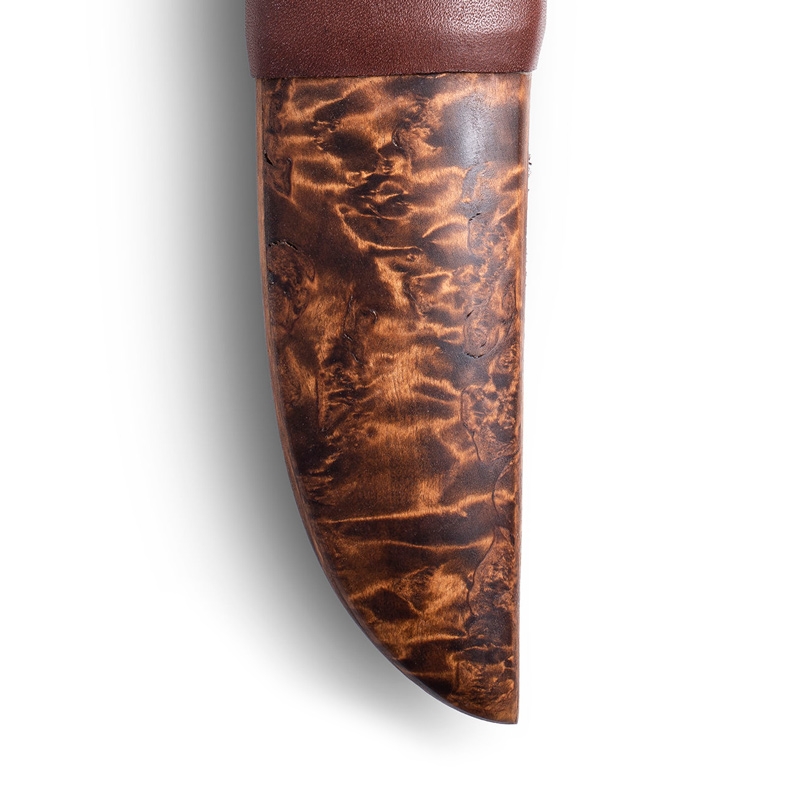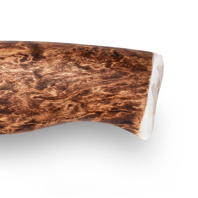 Fínsky lovecký nôž puukko Nalle z prvotriednej ocele, rukoväťou z brezy so zakončením zo sobieho parožia v puzdre z pravej kože a brezového dreva. Úhľadný funkčný dizajn s brezovou rukoväťou necháva vyniknúť štruktúre dreva.