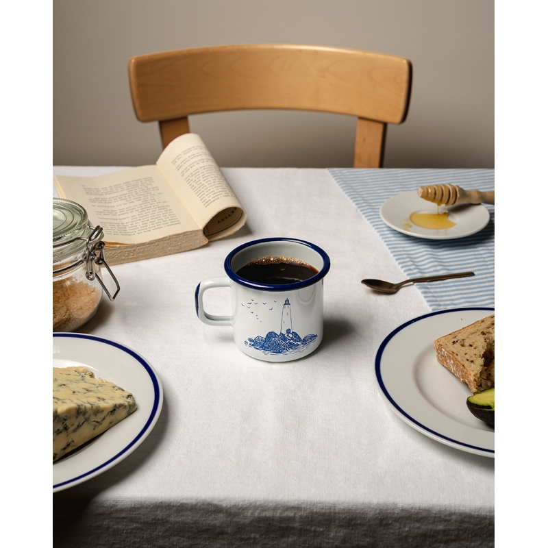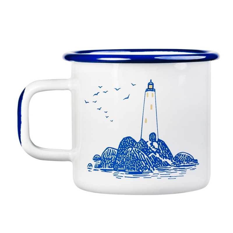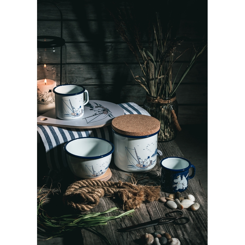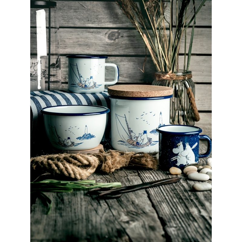 Námorníci Ahoj! Milý smaltovaný hrnček Moomin Sailors na motívy príbehov o Muminkoch od slávnej fínskej autorky Tove Jansson zobrazuje na jednej strane hlavných hrdinov na loďke a na druhej maják. Uško a okraj sú štýlovo dozdobené modrou farbou. Tove Jansson milovala more, ktoré tak má v jej príbehoch dôležitú úlohu. Skvelý darček pre všetkých dobrodruhov a námorníkov, ktorým utkveli v srdci rozprávky z údolia Muminov.