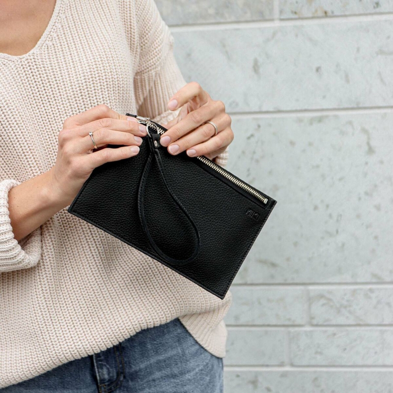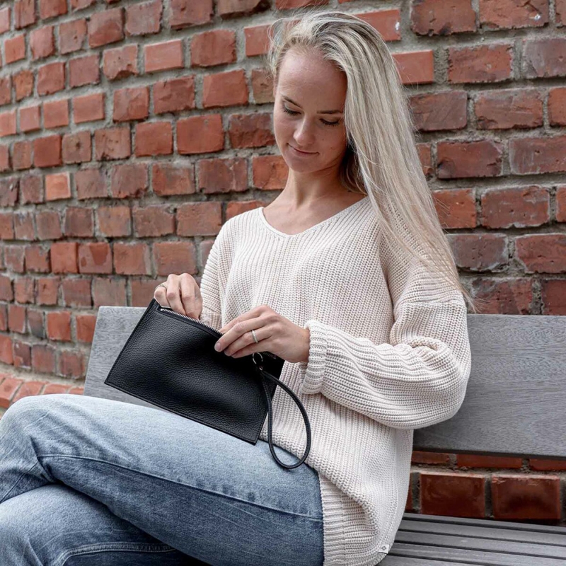Krásna taška Clutch vyrobená z pravej losej kože zaujme svojim výrazným kovovým zipsom a popruhom, ktorý sa nosí okolo zápästia. Vhodná je na nosenie telefónu, peňaženky a ďalších drobností a hodí na špeciálne príležitosti aj každodenné nosenie. Losia koža je mäkká, autentická a udržateľná a jej kvalita zostáva dlhodobo vynikajúca. Koža pochádza z voľne žijúcich losov a je vedľajším produktom primeranej regulácie losej populácie.