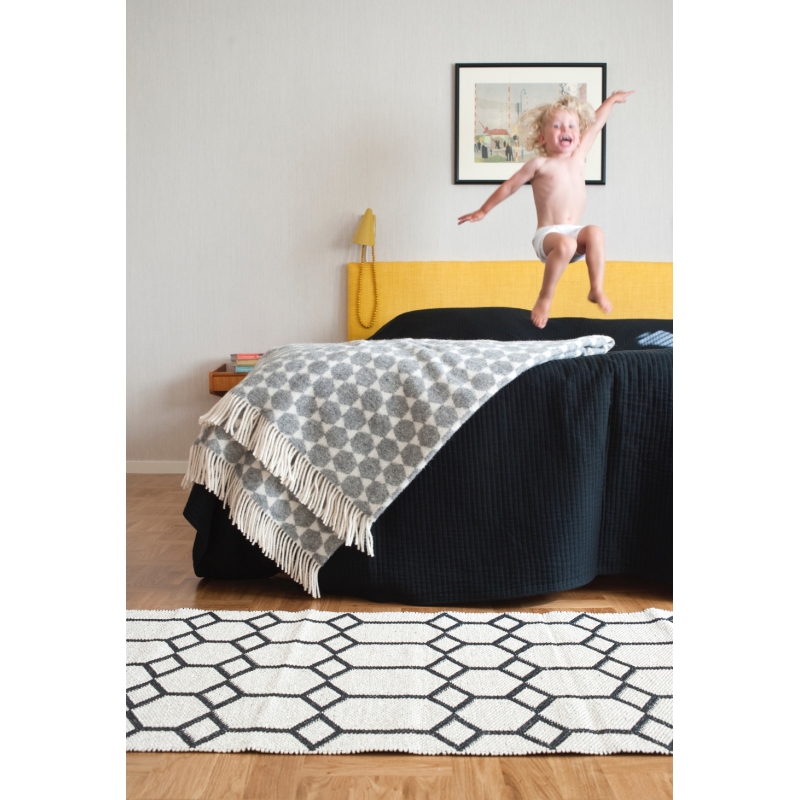 Ručne pletený kusový koberec Ingrid v čiernom odtieni zdobí geometrický vzor. Koberec je vhodný aj pre náročné prostredie vrátane vonkajšieho použitia na terase alebo balkóne. Veľmi dobre poslúži aj v kuchyni alebo v chodbe, kde klasické koberce trpia vlhkosťou a častejším znečistením. Vinylová fólia je protišmyková, odolná, možno ju vyprať a je vhodná pre alergikov.