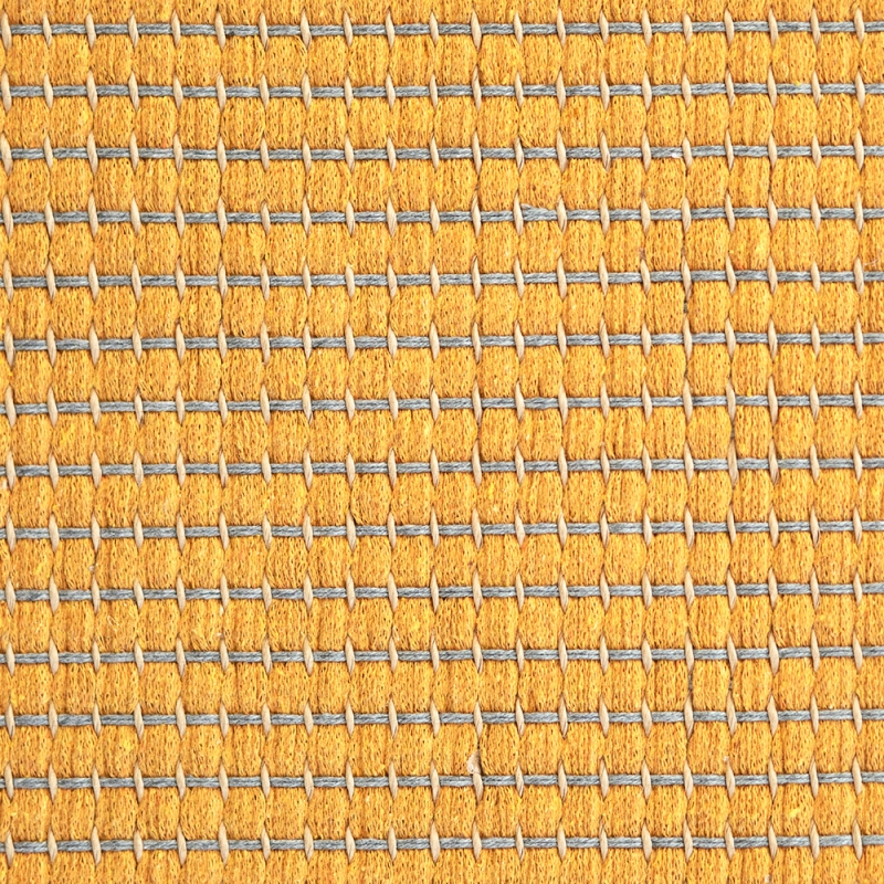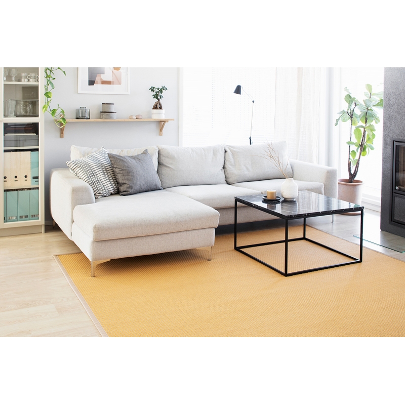 Kusový koberec Lyyra z bavlny a papierového vlákna v žltom odtieni s širokým lemom. Bavlna pretkané papierovým vláknom je elegantná a príjemná na chodidlá. Koberec je tak ideálny do spálne, obývačky alebo jedálne.