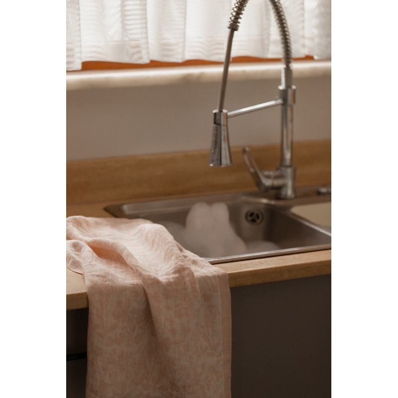 Kuchynská utierka je tkaná zo 100% ľanu s jemným kvetinovým vzorom Niitty v príjemnom ružovom odtieni. Ľan rýchlo schne a je tak praktický na každodennú prácu v kuchyni.