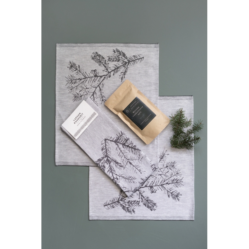 Prestieranie na stôl Havu s motívom smrekovej vetvičky od fínskeho maliara Teemu Järviho vás zavedie do vnútra divokej severskej prírody. Čiernobiely motív premyslený do posledného detailu vás očarí na prvý pohľad a úžasne doladí jedálenský stôl, či už v minimalistickom škandinávskom alebo aj vidieckom štýle. Prestieranie prinesie kúsok prirodzenej krásy na váš jedálenský stôl.